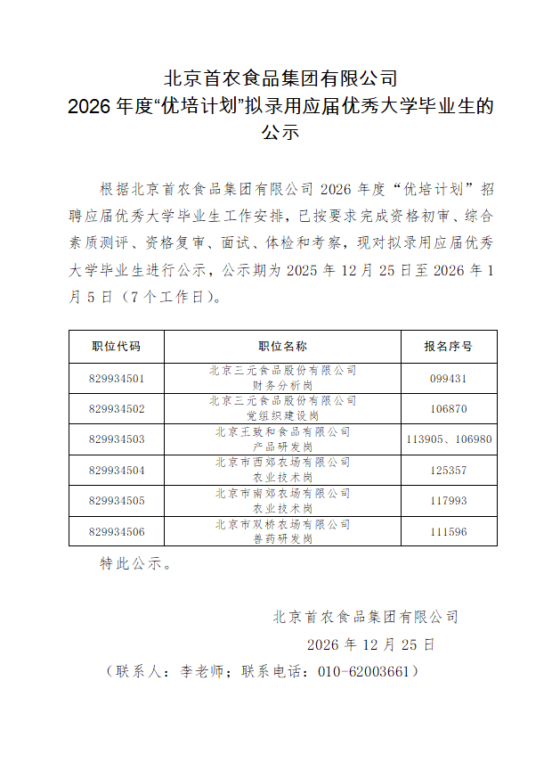 北京首农食品集团有限公司 2026年度“优培计划”拟录用应届优秀大学毕业生的公示
